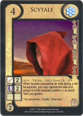 Scytale /ˈskaɪteɪl/ is a fictional character in the Dune universe created by Frank Herbert. In the novel Dune Messiah (1969), Scytale is a Tleilaxu Face Dancer who participates in the conspiracy to topple the rule of Paul Atreides.