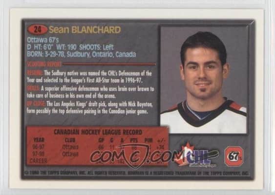 Sean Blanchard is a Canadian professional ice hockey defenceman currently playing for the Brantford Blast in Allan Cup Hockey. He was selected by the Los Angeles Kings in the fourth round of the 1997 NHL Entry Draft, and spent most of his professional career in Europe.