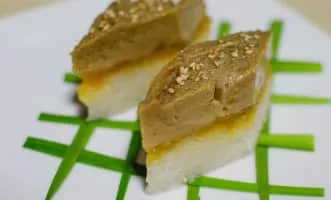 Seri Muka is a two-layered dessert with steamed glutinous rice forming the bottom half and a green custard layer made with pandan juice. Coconut milk is a key ingredient in making this kuih. It is used to impart creamy taste when cooking the glutinous rice and making the custard layer.