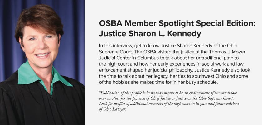 Sharon Lee Kennedy is an American jurist from Hamilton, Ohio who serves as an associate justice of the Ohio Supreme Court, after being elected on November 6, 2012. In 2022, she was elected to serve as the Chief Justice of the Ohio Supreme Court.