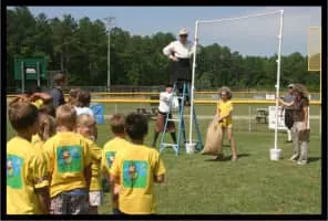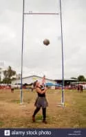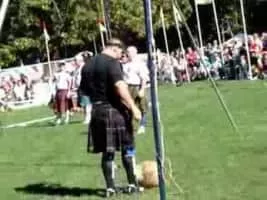 The sheaf toss is a traditional Scottish agricultural sport event originally contested at country fairs. A pitchfork is used to hurl a burlap bag stuffed with straw over a horizontal bar above the competitor's head. Typical weight for the bag is 16 pounds.