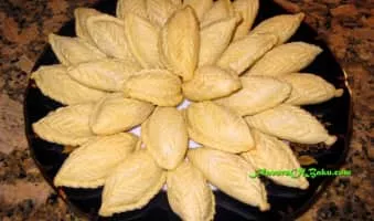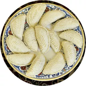 Shekerbura, is an Azerbaijani dessert. It is a sweet pastry in half-moon shape, filled with ground almonds, hazelnuts, or walnuts, and sugar. Shekerbura, shorgoghal, and pakhlava are all eaten in Azerbaijan mainly at the Novruz spring holiday.