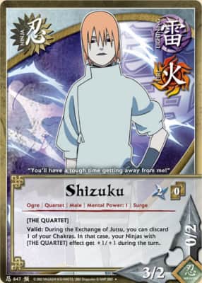 Shizuku was the lone female member of Yomi's gang, on a quest to release Mōryō. During the first encounter with Naruto and his team, she demonstrated impressive fire chakra skills that nearly killed Naruto.