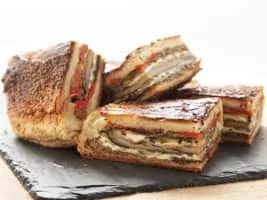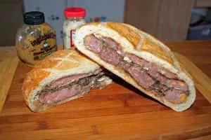 The shooter's sandwich is a steak sandwich prepared with cooked steak and mushrooms, salt and pepper that is placed inside a hollowed-out long loaf of bread and then weighed down. It originated in England from the Edwardian era, and is similar to the Beef Wellington.