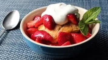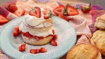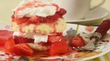 Shortcake is a sweet cake or biscuit. The earliest recipe for shortcake is in an English cookbook from 1588. Shortcake is typically made with flour, sugar, baking powder or soda, salt, butter, milk or cream, and sometimes eggs.