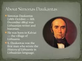 Simonas Daukantas was a Lithuanian/Samogitian historian, writer, and ethnographer. One of the pioneers of the Lithuanian National Revival, he is credited as the author of the first book on the history of Lithuania written in the Lithuanian language.