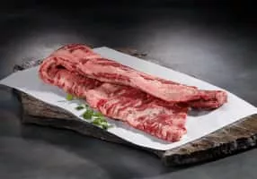 Skirt steak is a cut of beef steak from the plate. It is long, flat, and prized for its flavor rather than tenderness. It is not to be confused with flank steak, a generally similar adjacent cut nearer the animal's rear quarter.