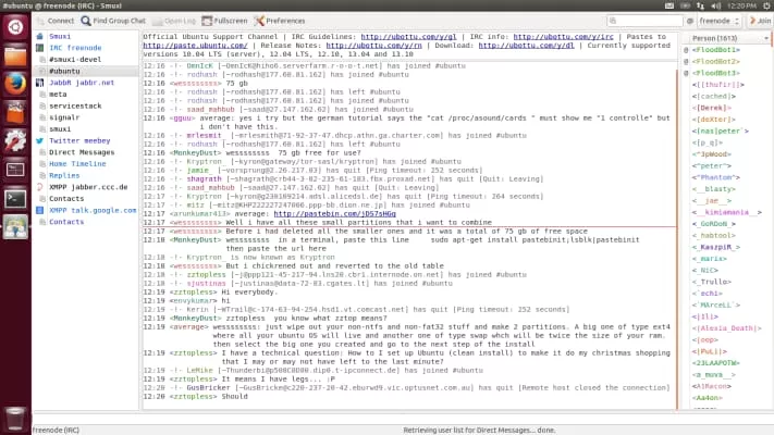 Smuxi is a cross-platform IRC client for the GNOME desktop inspired by Irssi. It pioneered the concept of separating the frontend client from the backend engine which manages connections to IRC servers inside a single graphical application.