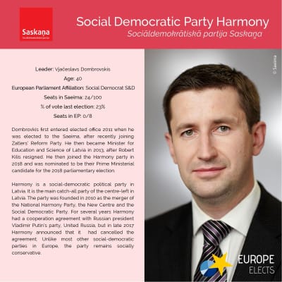 The Social Democratic Party "Harmony", also commonly referred to as Harmony, is a social-democratic political party in Latvia. It was the largest political party in the Saeima, representing the Russian minority of Latvia, before losing all of its parliamentary seats in the 2022 Latvian parliamentary election.