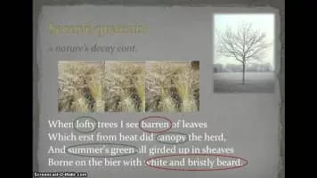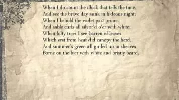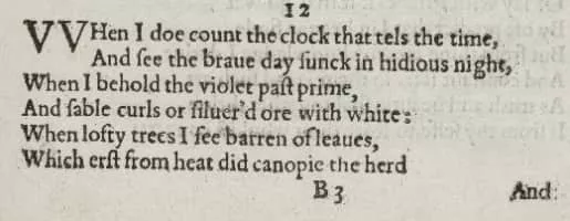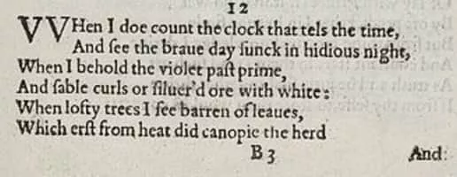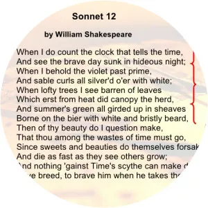 Sonnet 12 is one of 154 sonnets written by the English playwright and poet William Shakespeare. It is a procreation sonnet within the Fair Youth sequence. In the sonnet, the poet goes through a series of images of mortality, such as a clock, a withering flower, a barren tree and autumn, etc.