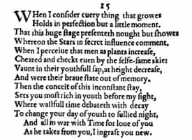Sonnet 15 is one of 154 sonnets written by the English playwright and poet William Shakespeare. It forms a diptych with Sonnet 16, as Sonnet 16 starts with "But. . . ", and is thus fully part of the procreation sonnets, even though it does not contain an encouragement to procreate.