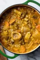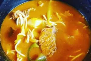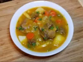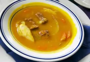 Soup joumou is a famous mildly spicy soup native to Haitian cuisine. The soup is traditionally based on a large winter squash that resembles a pumpkin. The squash slices are simmered in a saucepan along with pieces of beef, potato, plantains and vegetables such as parsley, carrots, green cabbage, celery and onions.
