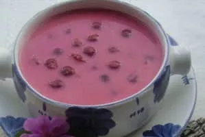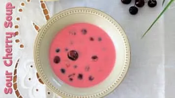 Sour cherry soup is a slightly sweet soup made with sour cream, sugar and whole fresh sour cherries, and served chilled. Originating in Hungarian cuisine, this soup is a summer delicacy in several European cuisines. The dish has been adopted by the Austrians, Poles, Slovaks, and Germans.