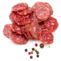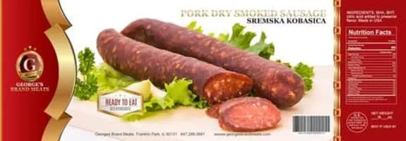 Sremska sausage is from Serbia. It has its origin in the Serbian area of Srem. It contains a mixture of beef and pork meat spiced with paprika, black pepper, salt and "secret spices". It is slightly smoked and medium ground.