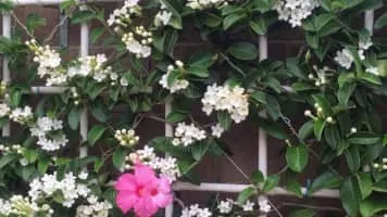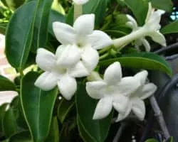 Stephanotis floribunda syn. S. jasminoides is a species of flowering plant in the family Apocynaceae, native to Madagascar. Growing to 6 m or more, it is an evergreen woody climber with glossy, leathery oval leaves and clusters of pure white, waxy, intensely fragrant tubular flowers.
