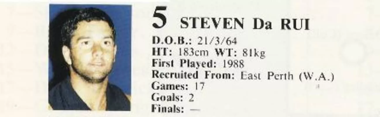 Steven Da Rui is a former Australian rules footballer who played with Carlton in the Victorian/Australian Football League. Da Rui, the son of Italian immigrants, played his early football at St Marks before joining WAFL club East Perth.