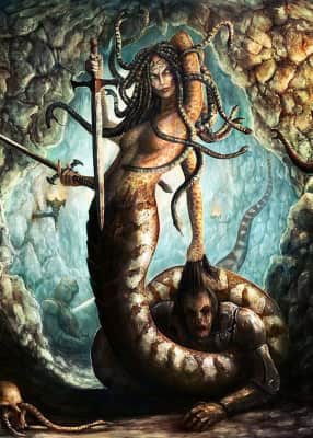 In Greek mythology, Stheno was the eldest of the Gorgons, vicious female monsters with brass hands, sharp fangs and "hair" made of living venomous snakes.