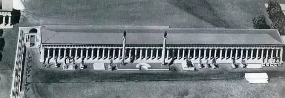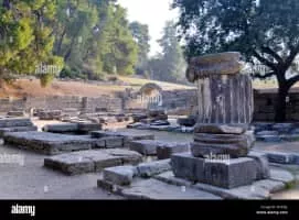 The Echo Stoa is located within the sanctuary of Zeus in Olympia, Greece. It is part of an ancient archaeological site excavated and preserved by the German Archaeological Institute at Athens. A stoa is a covered walkway or portico, typically colonnaded and open to the public.
