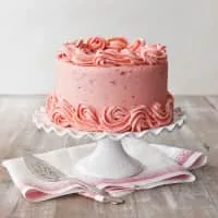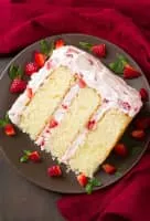 Strawberry cake is a cake that uses strawberry as a primary ingredient. Strawberries may be used in the cake batter, atop cakes and in a strawberry cake's frosting. Some are served chilled or partially frozen, and they are sometimes served as a Valentine's Day dish.