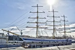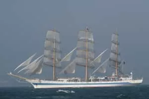 STS Mir is a three-masted, full rigged training ship, based in St. Petersburg, Russia. It was built in 1987 at the Lenin Shipyard in Gdańsk, Poland. Mir is the second largest of six sister ships designed by Polish naval architect Zygmunt Choreń and weighs 2,385 tonnes.