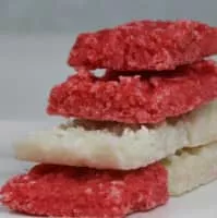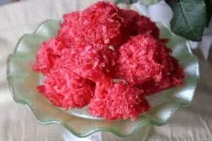 Sugar cakes are confections made with grated coconut, sugar, and food coloring. Cooking is done in a saucepan on low heat to avoid burning, and moulding is done immediately afterwards on a baking sheet or shallow plate.