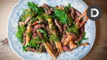 Surf and turf or surf 'n' turf is a main course combining seafood and red meat. The seafood used may be lobster, prawns, or shrimp, which may be steamed, grilled or breaded and fried. When served with lobster, the lobster tail or a whole lobster may be served with the dish.