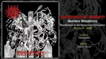 Surrender Of Divinity is a black metal act from Bangkok, Thailand. The group was formed in 1996, and released 2 full-length albums during the 2000s. Their 2006 album Manifest Blasphemy: The Abortion of the Immaculate Conception was reviewed by Metal Hammer.