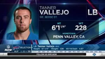 Tanner Vallejo is an American football linebacker for the Arizona Cardinals of the National Football League. He played college football at Boise State. He was drafted by the Buffalo Bills in the sixth round of the 2017 NFL Draft. Vallejo also previously played for the Cleveland Browns, and Washington Redskins.