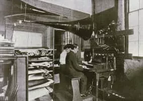 The Telharmonium was an early electrical organ, developed by Thaddeus Cahill circa 1896 and patented in 1897. The electrical signal from the Telharmonium was transmitted over wires; it was heard on the receiving end by means of "horn" speakers.