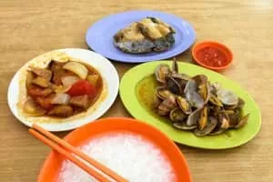 Teochew porridge is a Teochew rice porridge dish often accompanied with various small plates of side dishes. Teochew porridge is served as a banquet of meats, fish egg and vegetables eaten with plain rice porridge. It may be simply cooked without flavour, or include sweet potatoes.