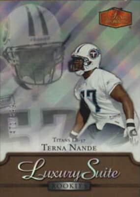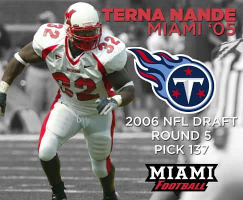 Terna Nande is a former American football linebacker. He was drafted by the Tennessee Titans in the fifth round of the 2006 NFL Draft after becoming the first and only non-lineman in NFL history to bench press over 40 reps at the NFL Combine. He played college football at Miami University.