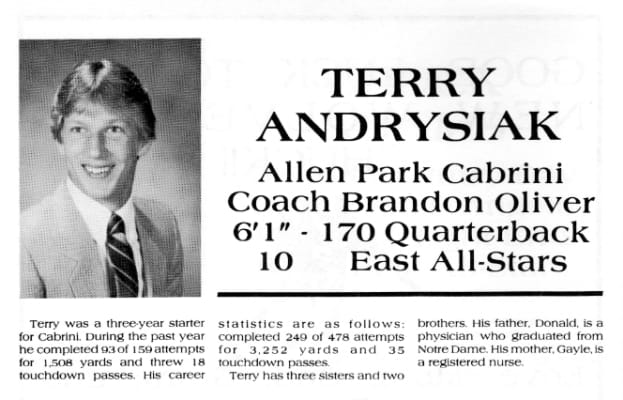 Terrence J. Andrysiak is a former American football quarterback for St. Frances Cabrini High School and the University of Notre Dame. He is currently a financial executive for The Horizon Group, Raymond James in Fenton, Michigan.
