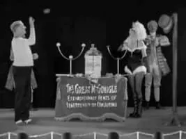 The Great McGonigle (W. C. Fields) skips town, juggles and gets by with his troupe doing "The Drunkard. "