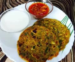 Thepla is a soft Indian flatbread typical of Gujarati cuisine and especially popular among Jains. It is typically enjoyed as a breakfast, as a side dish with a meal, or as a snack in the late afternoon. Thepla can be made with wheat flour, besan, methi and other spices.