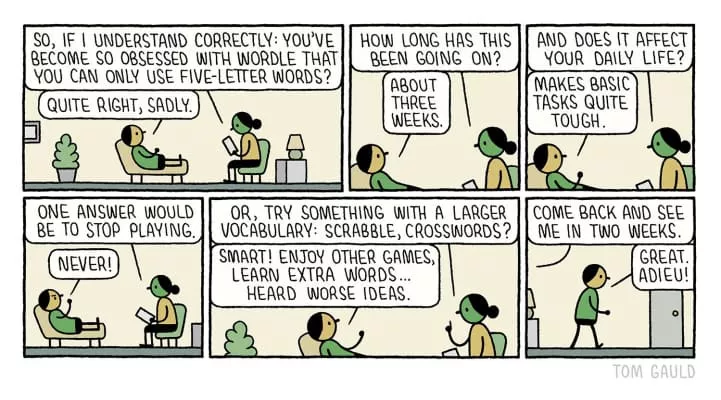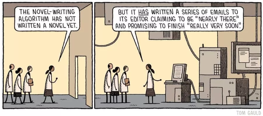 Tom Gauld is a Scottish cartoonist and illustrator. His style reflects his self-professed fondness of "deadpan comedy, flat dialogue, things happening offstage and impressive characters".