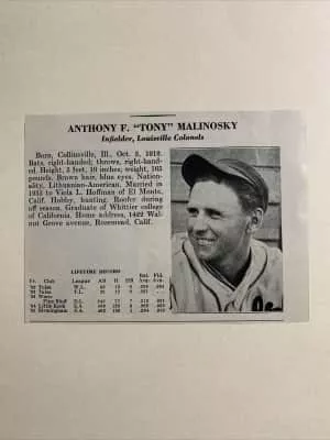 Anthony Francis Malinosky was an American baseball player. He played third baseman and shortstop in Major League baseball in 35 games for the Brooklyn Dodgers in the 1937 season. Listed at 5' 10", Weight: 165 lb., he batted and threw right-handed.
