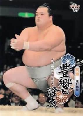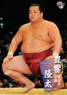 Toyohibiki Ryūta is a former Japanese professional sumo wrestler from Toyoura, Yamaguchi. He turned professional in 2005, reaching the top makuuchi division in July 2007. He has earned two special prizes for Fighting Spirit, and one gold star for a yokozuna upset. His highest rank was maegashira 2.