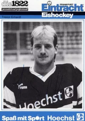 Trevor Erhardt is a Canadian former professional ice hockey player. Erhardt is regarded as one of the crowd favorites in Frankfurt hockey. He played for both the Eintracht Frankfurt, as well as for ESC Frankfurt, and his jersey #27 has been retired in Frankfurt.