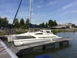 A trimaran is a multihull boat that comprises a main hull and two smaller outrigger hulls which are attached to the main hull with lateral beams. Most modern trimarans are sailing yachts designed for recreation or racing; others are ferries or warships.