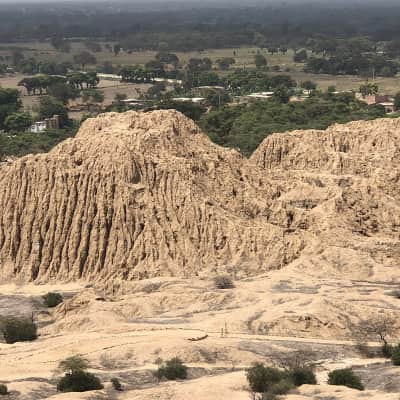Túcume is a pre-Hispanic site in Peru, south of the La Leche River on a plain around La Raya Mountain. It covers an area of over 540 acres and encompassing 26 major pyramids and mounds. The area is referred to as Purgatorio by local people.