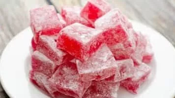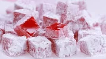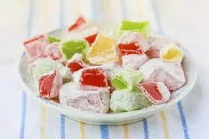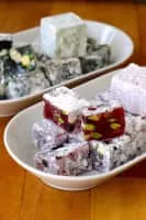 Turkish delight or lokum is a family of confections based on a gel of starch and sugar. Premium varieties consist largely of chopped dates, pistachios, and hazelnuts or walnuts bound by the gel; traditional varieties are often flavored with rosewater, mastic, Bergamot orange, or lemon.