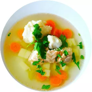 Ukha is a clear Russian soup, made from various types of fish such as bream, wels catfish, northern pike, or even ruffe. It usually contains root vegetables, parsley root, leek, potato, bay leaf, dill, tarragon, and green parsley, and is spiced with black pepper, saffron, nutmeg, and fennel seed.