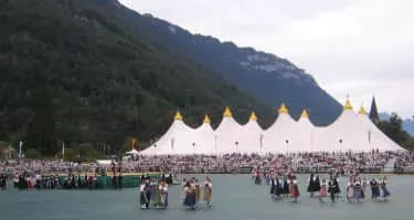 Unspunnenfest is a festival held in the town of Interlaken, Switzerland, near the old ruin of Unspunnen Castle, in the Bernese Alps, approximately once every twelve years, most recently in 2017. The festival highlights traditional Swiss culture and features competitions of Steinstossen, Schwingen and yodeling.