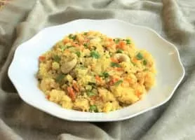 Upma, uppumavu or uppittu is a dish originating from the Indian subcontinent, most common in South Indian, Maharashtrian, and Sri Lankan Tamil breakfast, cooked as a thick porridge from dry-roasted semolina or coarse rice flour.