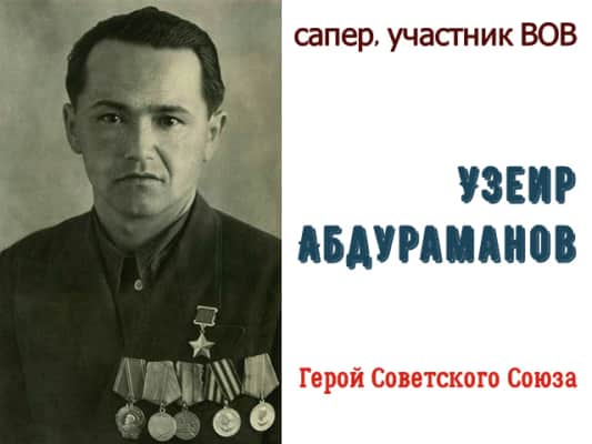 Uzeir Abduramanovich Abduramanov was a sapper in the Red Army during the Great Patriotic War. After securing the safe transfer of troops across the Sozh river under heavy enemy fire and through icy water, he was declared a Hero of the Soviet Union on 15 January 1944.
