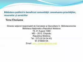 Vera Osoianu is a librarian from Moldova. She is the deputy director of the National Library of Moldova. Vera Osoianu was awarded, by a presidential decree, with Romania's highest state decoration – the Order of the Star of Romania.