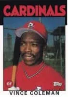 Vincent Maurice Coleman is an American former Major League Baseball player, best known for his years with the St. Louis Cardinals. Primarily a left fielder, Coleman played from 1985 to 1997 and set a number of stolen base records. He was a switch hitter and threw right-handed.