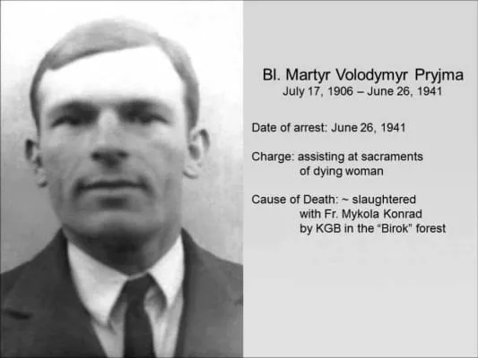 Volodymyr Pryjma was a Ukrainian Greek Catholic choir director and martyr. Pryjma was born on 17 July 1906 in the village of Stradch, Yavoriv District. He graduated from a school for cantors, which was at that time under the care of Metropolitan Andrey Sheptytsky.