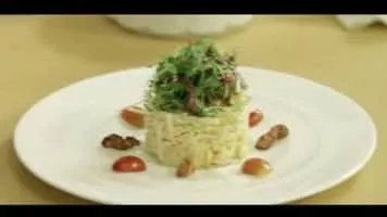 A Waldorf salad is a fruit and nut salad generally made of fresh apples, celery, grapes and walnuts, dressed in mayonnaise, and traditionally served on a bed of lettuce as an appetizer or a light meal. The apples, celery, and grapes can all be green, which harmonizes the color palette of the dish.