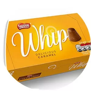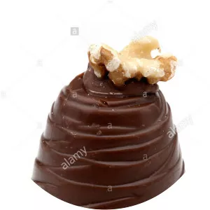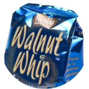 A Walnut Whip is a whirl-shaped cone of milk chocolate with a whipped vanilla fondant filling, topped with a half-walnut.